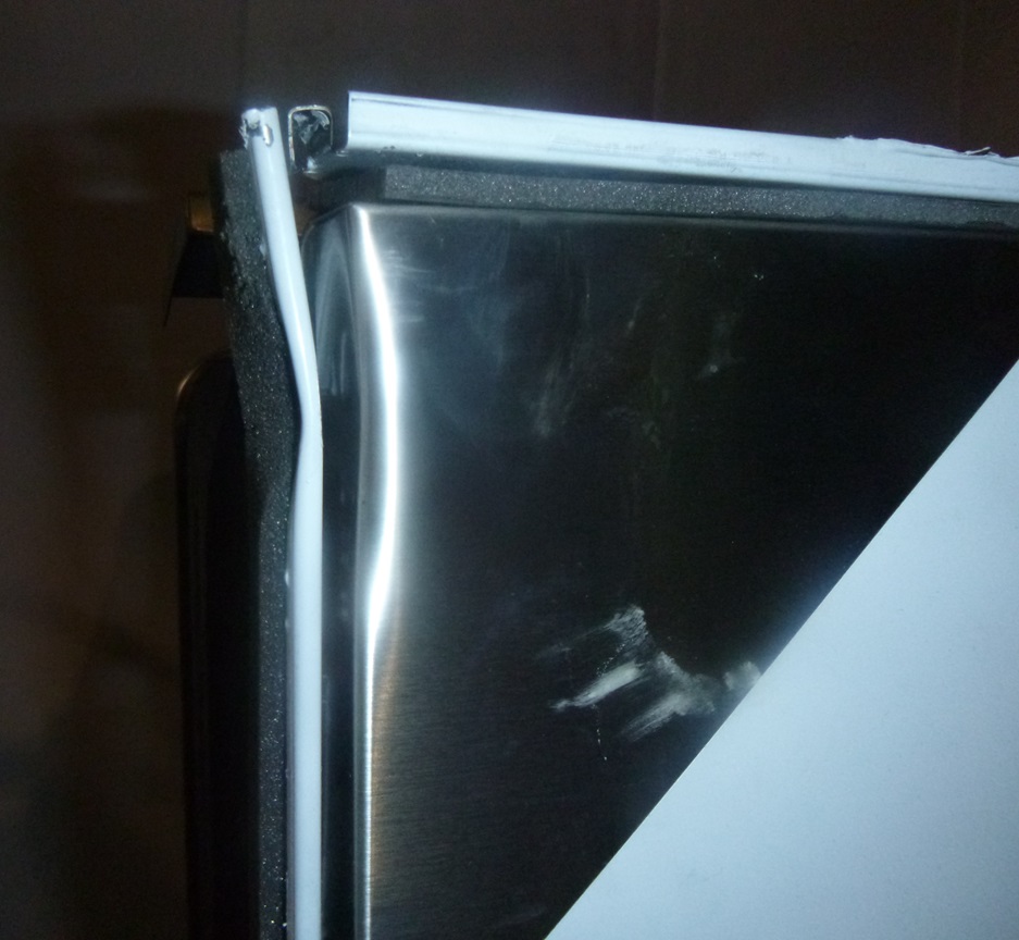 **Serial 30930116 - here is a dent on the top left edge of the door and the toe kick has some marks on it. It has not been used nor installed and has everything with it.**