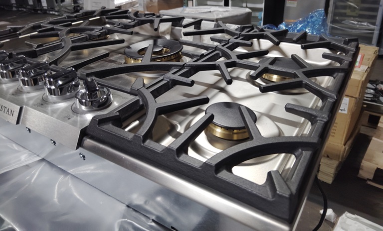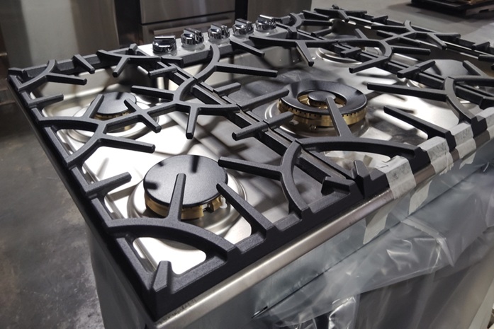 - Patent-pending heavy-duty cast-iron continuous grates allow for easy movement of cookware and maximize cooking surface.