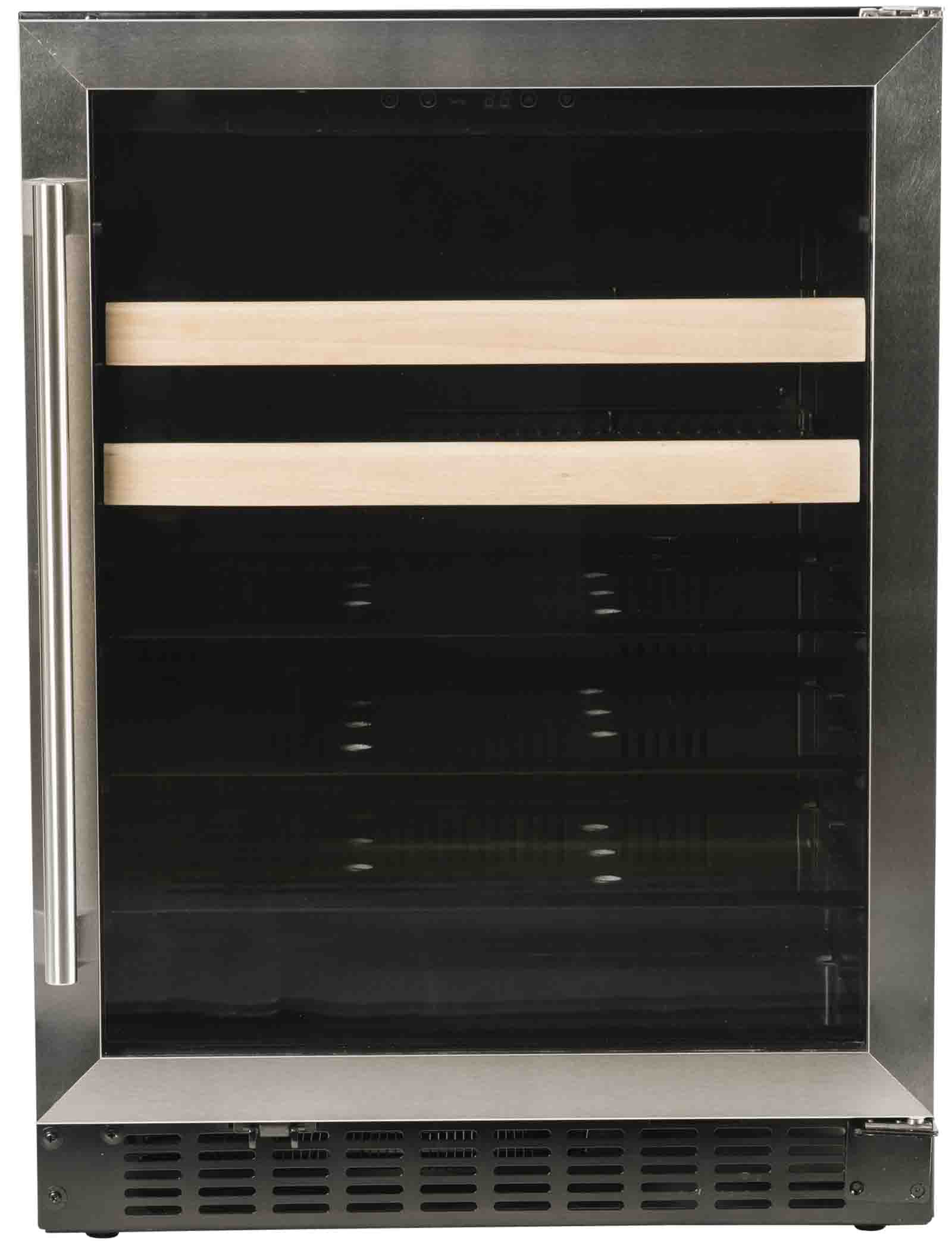 24 Inch Beverage Center with Blue LED Lighting, Glass Shelving, Wine Racks, Field Reversible Door, Digital Display Controls, Auto Defrost, A.D.A. Compliant and 3 cu. ft. Capacity: Panel Ready-Glass